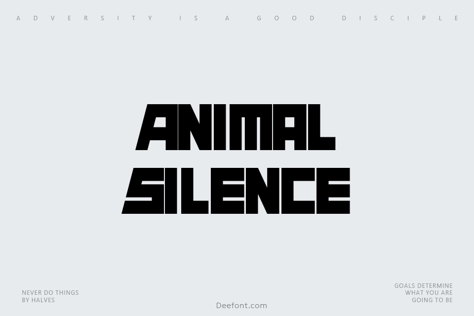 Animal Silence is a bold and geometric display font with a futuristic and industrial aesthetic. Featuring sharp angles and straight lines, this typeface commands attention with its striking uppercase letters and robust lowercase characters. The font’s blocky and modern appearance makes it ideal for headlines, logos, video game graphics, and any project requiring a strong visual statement. Perfect for branding, posters, and impactful designs that demand modern assertiveness.