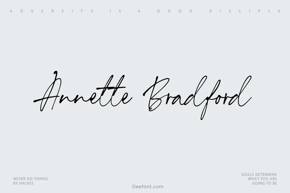 Annette Bradford is a sophisticated ballpoint script font that captures the natural flow of handwritten signatures with refined, elegant letterforms. Featuring smooth, continuous strokes reminiscent of premium ballpoint pen work, this typeface excels in creating personal, polished designs. The font’s relaxed yet refined aesthetic makes it ideal for digital signatures, wedding invitations, branding materials, greeting cards, and upscale packaging. Each character maintains consistent proportions while preserving the authentic handwritten warmth that distinguishes it from mechanical typefaces, making it the perfect choice for projects requiring both sophistication and genuine human touch.