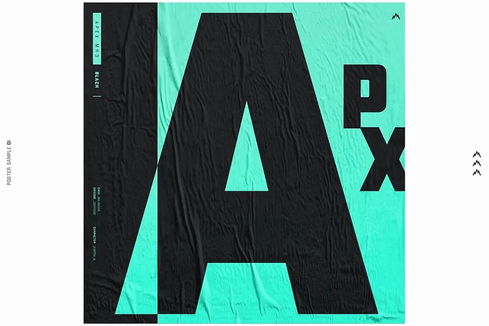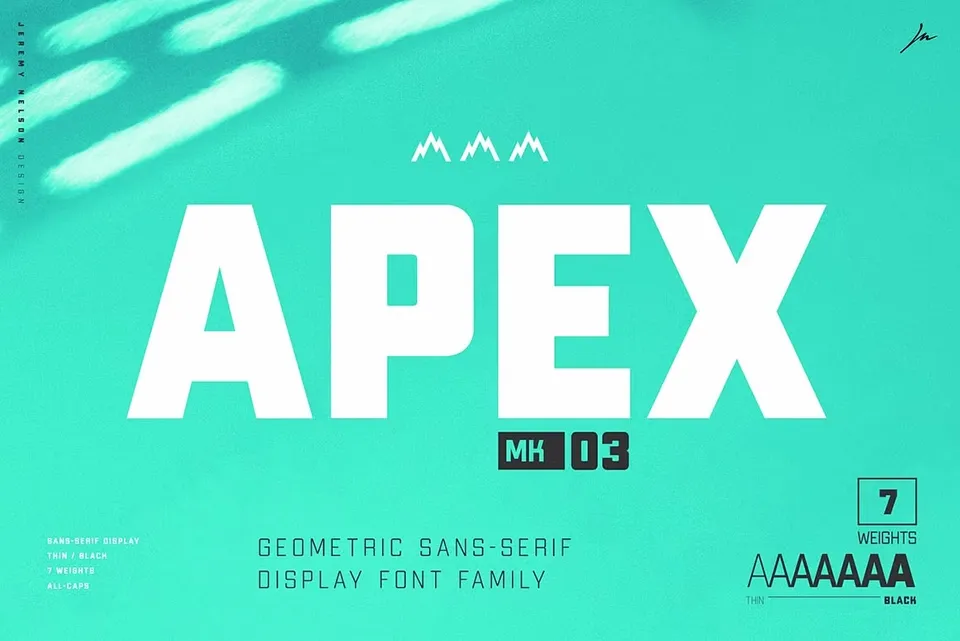 The Apex Mk3 Font Family is a robust geometric sans-serif display typeface inspired by classic geometric forms, sans serifs, and athletic block type. Designed for bold headlines and a strong visual presence, its simplicity and geometric structure provide flexibility for a wide range of uses. The family includes seven weights from Thin (100) to Black (900), supporting Western European languages and offering versatility for modern branding, editorial, and display applications.
