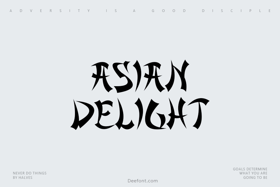 Asian Delight is a bold and dynamic display font inspired by traditional Asian calligraphy with modern sensibilities. Featuring sharp, angular strokes and flowing calligraphic style, it presents exaggerated curves and pointed edges that deliver energetic and artistic flair. The font comprises 236 characters including uppercase letters, lowercase letters, numbers, and special characters, maintaining consistent stylistic coherence throughout. Perfect for creating striking visual impact in logos, posters, branding projects, and headlines that demand an artistic touch and contemporary Asian aesthetic appeal.