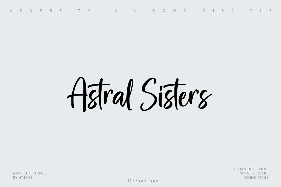 Astral Sisters is an elegant handwritten script typeface that combines flowing, organic letterforms with contemporary styling, making it perfect for display designs including posters, headers, invitations, and creative branding. Featuring 183 glyphs and smooth curved strokes characteristic of modern calligraphic design, this font delivers a sophisticated yet approachable aesthetic ideal for designs requiring personality and visual impact, from editorial layouts to social media graphics and greeting cards.