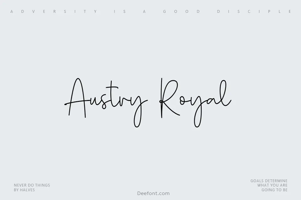 Austry Royal is a refined handwritten display font characterized by thin, flowing strokes and elegant calligraphic details that evoke sophistication and artistry. The font’s delicate letterforms showcase natural handwriting qualities with consistent, sophisticated curves that work exceptionally well for wedding invitations, elegant branding, creative logos, decorative posters, and personalized design projects where personality and elegance matter most. Its playful yet refined nature makes it ideal for headline typography.