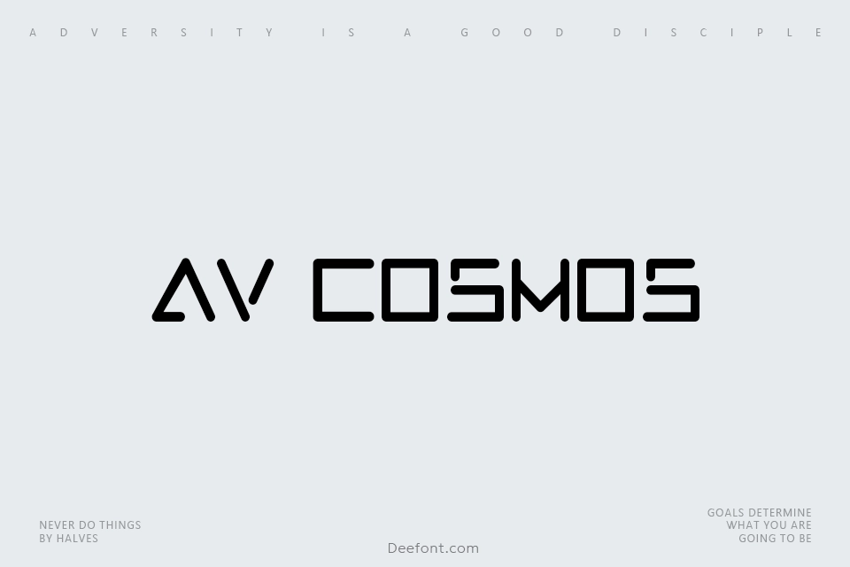 AV Cosmos is a futuristic monospaced typeface designed with rounded corners for a friendlier appearance, perfect for display purposes and science-related content. This geometric sans serif font features sharp edges and straight lines that create a modern, minimalist aesthetic ideal for branding, advertising, and packaging projects. With its clean design and unique futuristic style, AV Cosmos brings an innovative touch to creative designs, making it particularly suitable for tech-focused and sci-fi themed typography work.