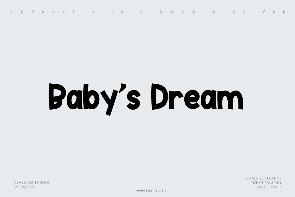Baby’s Dream is a charming and playful display font featuring whimsical, rounded letterforms with bouncy appeal. Designed to evoke innocence and creativity, this font is perfect for children’s books, greeting cards, invitations, and creative projects targeting young audiences. With its soft curves and delicate strokes, Baby’s Dream captures a magical, dreamy quality that brings imaginative ideas to life. The font includes 94 glyphs and supports multiple languages, making it versatile for various design applications. Its easy-to-read style and contemporary twist ensure visibility while maintaining playful charm across all creative endeavors.