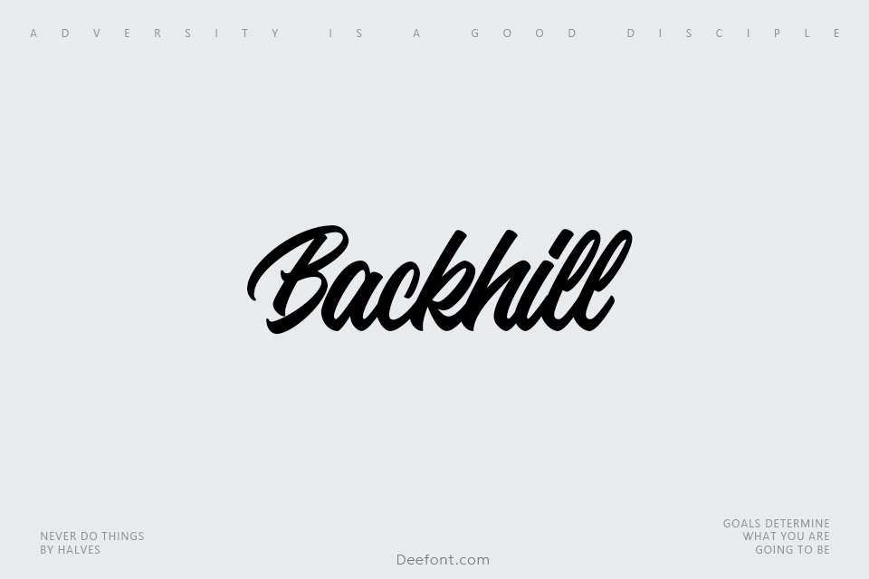 Backhill is a handcrafted script font inspired by classic posters, featuring distinctive brush strokes and elegant letterforms. This display typeface includes uppercase and lowercase letters, numerals, punctuation marks, and extensive OpenType alternates with common ligatures and swash variations for versatile design applications. Perfect for logotypes, letterheads, posters, apparel designs, and labels, Backhill delivers authentic hand-drawn character with professional typographic quality.