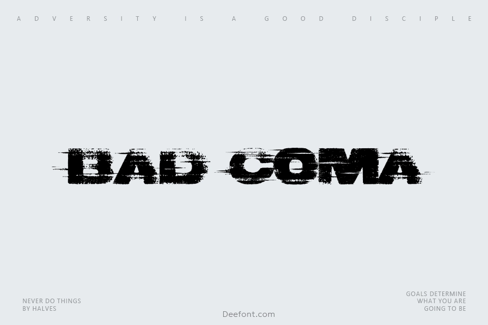 Bad Coma is a bold, distressed display font characterized by its grunge and distorted aesthetic. Designed with eroded letterforms and textured appearance, this striking typeface delivers an edgy, urban feel perfect for headlines, posters, and eye-catching designs. Featuring 236 glyphs of uppercase letters, numbers, and special characters, Bad Coma conveys a rebellious spirit with controlled chaos, making it ideal for music album covers, streetwear branding, and contemporary creative projects seeking a raw, industrial impact.