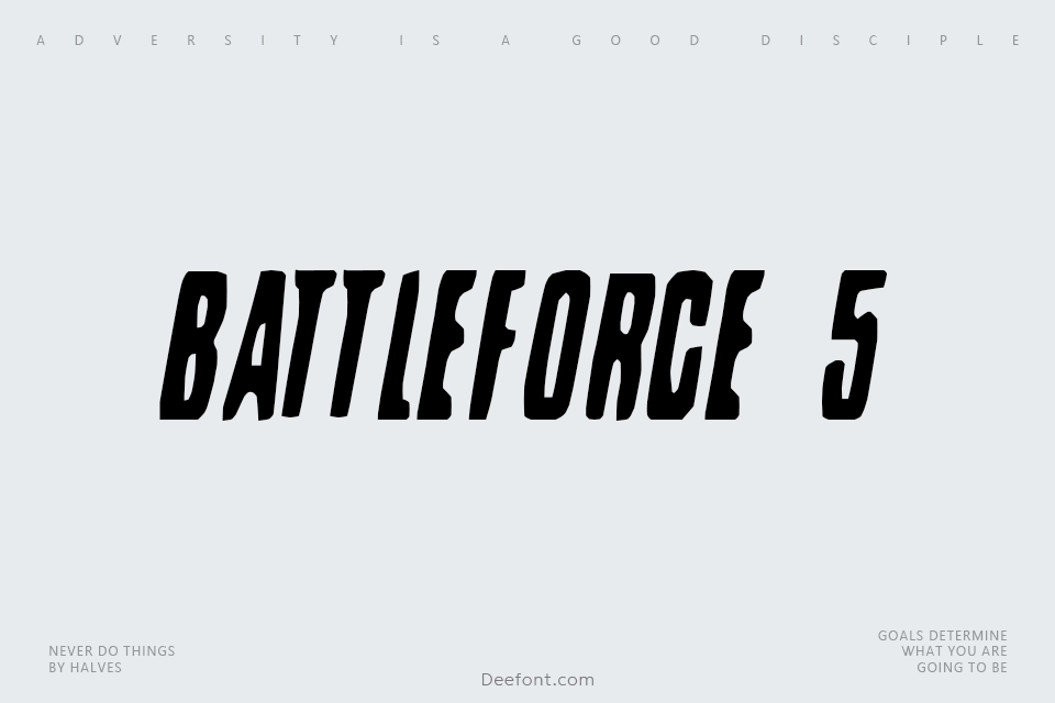 Battleforce 5 is a bold and dynamic display font inspired by the opening title sequence of the popular children’s TV series. Featuring sharp, angular edges and a futuristic aesthetic, this font delivers strong visual impact for headlines and creative projects. The condensed letterforms with slanted orientation create a sense of motion and speed, making it ideal for video game titles, sports branding, and action-oriented designs.