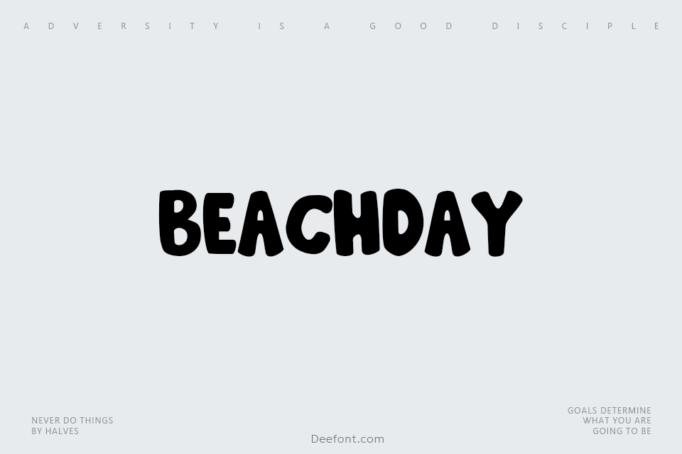 Beachday is a vibrant display font that brings a playful, beachy aesthetic to your creative projects. Perfect for summer-themed designs, casual invitations, and fun branding materials, this charming typeface combines bold characters with a friendly, cartoonish personality that captures the essence of relaxation and joy. With its distinctive character set and decorative appeal, Beachday transforms ordinary text into eye-catching typography that instantly elevates any design project requiring a touch of whimsy and coastal charm.