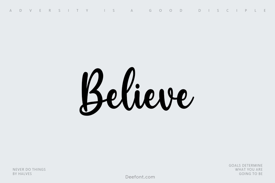 Believe is a modern and whimsical script font that combines trendy aesthetics with versatile functionality. Designed by Aldi Raya Pradipta through Graphix Line Studio, this elegant typeface features sleek lines and playful curves perfect for logos, branding, social media graphics, and creative projects. Its clean legibility ensures your message remains clear while maintaining a unique, charming aesthetic that elevates any design. With its contemporary vibe and handwritten appeal, Believe is the ideal choice for designers seeking to add sophistication and personality to their typography.