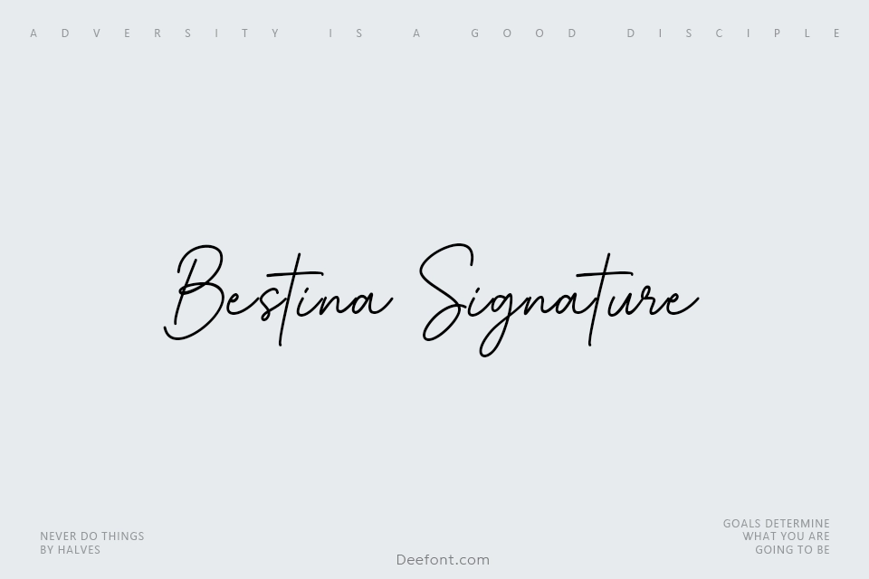 Bestina Signature is an exquisite monoline script handwriting font characterized by delicate and graceful curved lines, perfect for adding personal sophistication to your designs. This elegant signature-style typeface creates exceptional visual appeal for logos, wedding invitations, branding materials, and marketing projects. With its fluid, natural handwritten aesthetic, Bestina Signature transforms ordinary text into captivating typography that embodies elegance and refinement, making it ideal for designers seeking authentic and sophisticated visual statements.