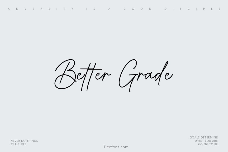 Better Grade is an elegant modern signature script font crafted by Heinzel Std, blending smooth flowing strokes with a refined handwritten aesthetic. This versatile typeface features beautiful ligatures, alternate characters, and multilingual support, making it ideal for logos, branding, wedding invitations, product packaging, business cards, photography watermarks, social media content, and editorial designs. With its sophisticated yet approachable character, Better Grade brings timeless elegance and natural charm to creative projects, offering designers the perfect balance between formal polish and personal touch.