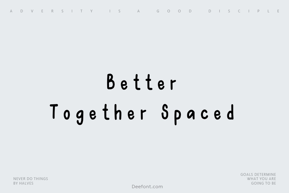 Better Together Spaced is a playful handwritten font designed with rounded edges and a casual, friendly aesthetic. The font features slightly uneven letters and a natural organic feel, making it perfect for greeting cards, social media graphics, and creative branding projects. With balanced character spacing and a modern touch, this versatile typeface brings an informal yet approachable charm to any design.