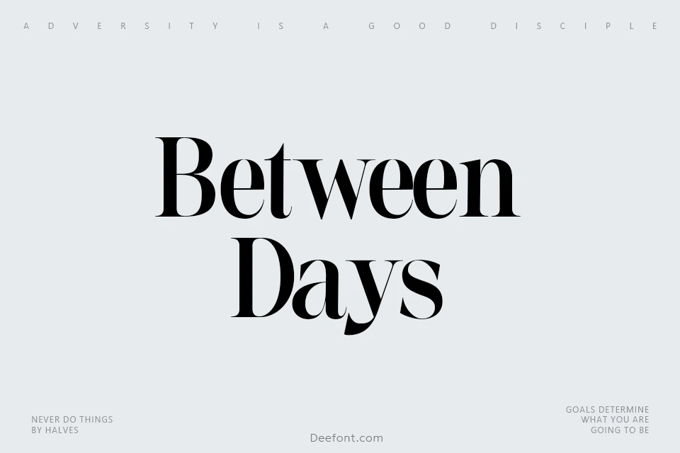Between Days Font is a sophisticated, high-contrast serif font designed for premium quality and a luxurious feel. Carefully crafted, it is ideal for logos, headlines, titles, invitations, labels, magazines, books, greeting and wedding cards, packaging, fashion, makeup, stationery, novels, and various advertising purposes. The font features numbers, punctuation, multilingual support, ligatures, alternates, and is PUA encoded, making it versatile for creative and formal design projects.