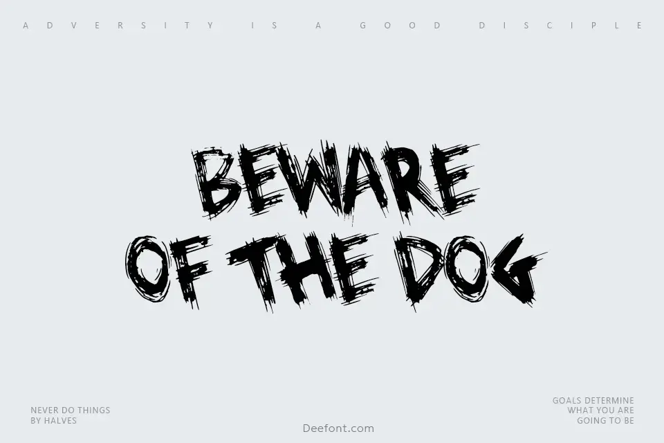 Beware of the Dog is a distressed horror display font featuring sharp, jagged edges and irregular letter forms that evoke a menacing, aggressive aesthetic. The typeface excels at creating an unsettling visual impact with its rough, hand-drawn characteristics and bold strokes. Ideal for Halloween posters, horror movie titles, scary flyers, festival artwork, tattoo designs, and any project requiring a menacing, eye-catching presence. The font’s erratic letterforms and textured appearance make it particularly effective for dramatic headlines and display applications that demand immediate attention and convey a sense of danger or dread.