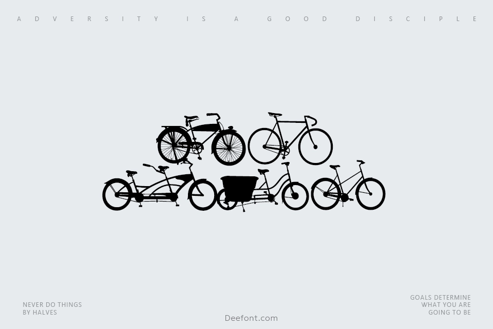 Bikes is a distinctive dingbat font designed with bicycle enthusiasts in mind. The capital letters feature detailed silhouettes of various cycles, while the lowercase letters offer simplified versions suitable for smaller applications. Created in December 2011 and updated in January 2014, this font combines functionality with creative flair. It contains 63 unique glyphs that bring cycling-themed designs to life. Perfect for bike-related projects, sports applications, and creative typography work that celebrates the joy of cycling.
