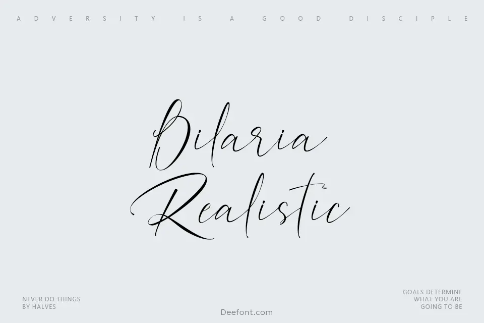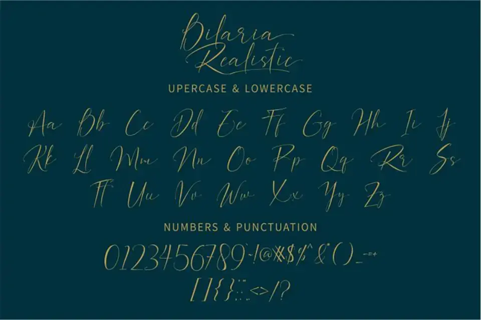Bilaria Realistic is a beautiful handwritten script typeface that captures the authentic essence of hand-drawn calligraphy with flowing curves and graceful letterforms. This font features sweeping, elegant strokes that deliver timeless sophistication and natural character. Ideal for wedding invitations, branding projects, product packaging, logo design, greeting cards, and editorial layouts, the font combines modern aesthetic sensibilities with classic cursive elegance. With extensive language support, accents, and swash variations, Bilaria Realistic brings refined polish and personalized warmth to any creative project.