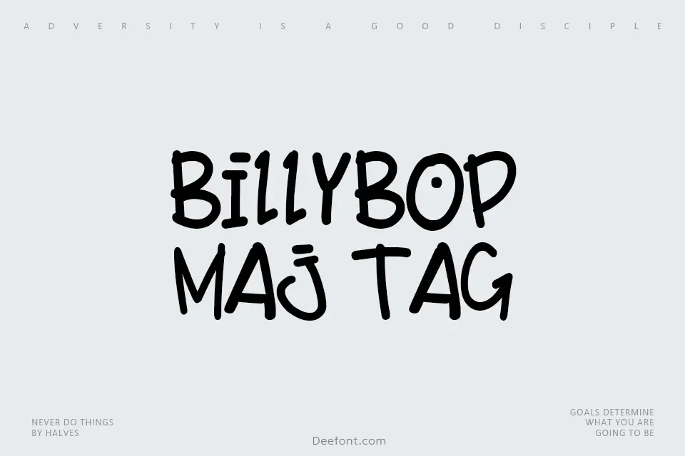 BillyBop Maj Tag is a vibrant script and graffiti font designed for creative typography projects. This free typeface features bold, playful letterforms with an urban tag style, perfect for posters, logos, and decorative designs. Originally created in 2011, the font delivers authentic graffiti aesthetics with smooth curves and dynamic character shapes. Ideal for designers seeking eye-catching display typography with a contemporary edge, this font brings artistic flair and personality to any creative endeavor.