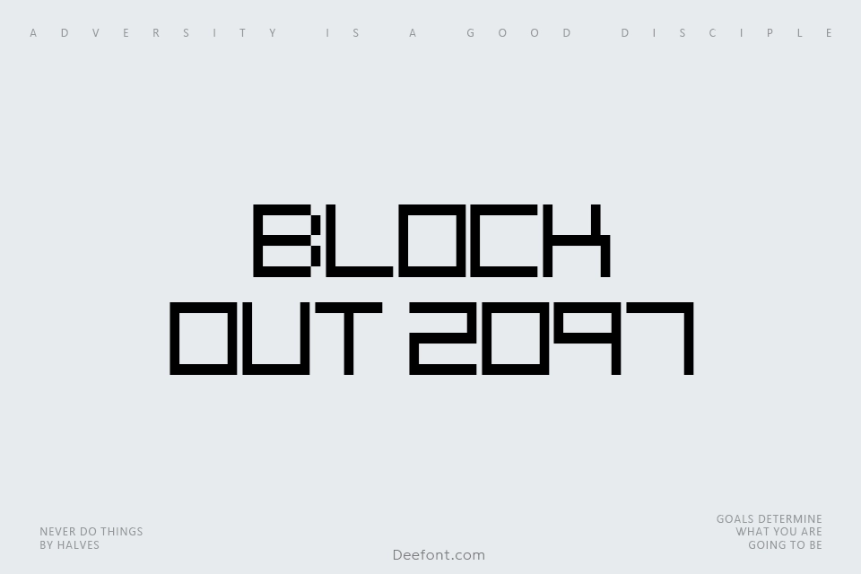 Block Out 2097 is a striking futuristic bitmap font designed by Matthew Sephton, featuring bold geometric characters with sharp angular lines and a digital, pixelated appearance. Inspired by early digital displays and video game graphics, this typeface delivers a distinctive retro-tech aesthetic with a monospaced feel. Each character maintains uniform height and width, creating a clean and organized look perfect for headlines, logos, and creative projects that demand a unique visual presence and modern appeal.