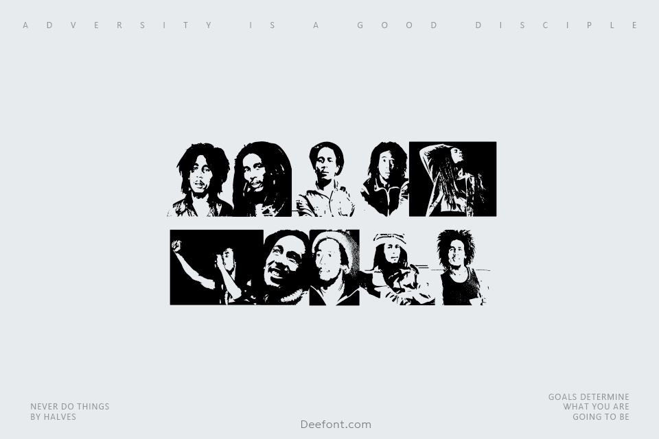 Bob Marley is a distinctive dingbats and music-themed font created as a tribute to the reggae legend. Designed by Chanaka Liyanage, this decorative typeface features 103 glyphs that combine symbolic and typographic elements. Perfect for music-related projects, event invitations, and creative designs, the font brings a vibrant reggae spirit to your typography with its unique character set and expressive visual style ideal for posters, band merchandise, and entertainment branding.