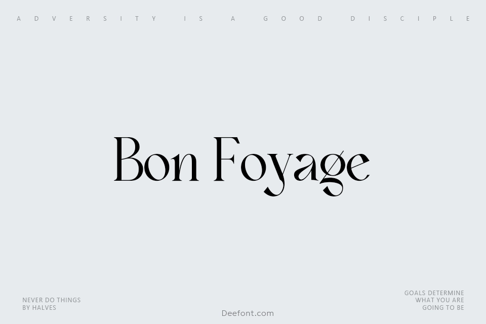 Bon Foyage is an elegant serif typeface designed with timeless beauty and sophisticated charm. This versatile font combines classic proportions with refined details, making it perfect for editorial designs, branding projects, and print materials. With its graceful letterforms and balanced strokes, Bon Foyage brings a touch of elegance and professionalism to any creative work.