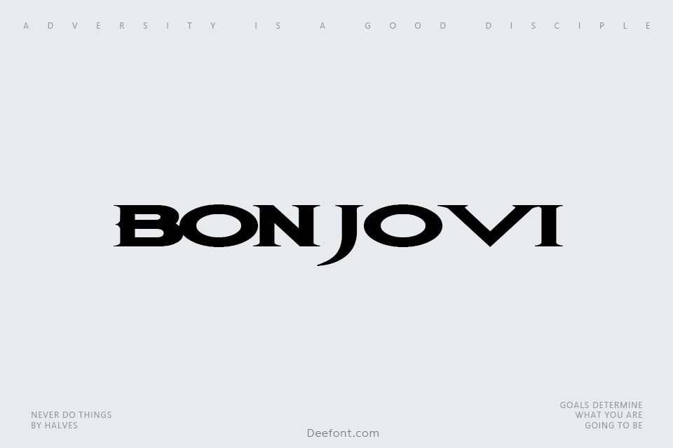 Bon Jovi is a bold display serif typeface with sharp, angular serifs and a commanding presence. Characterized by its heavy, decorative style, this font features uppercase letters with pronounced serifs that deliver a striking visual impact. Containing 224 glyphs with support for basic Latin and extended characters, the typeface is ideal for music-related projects, album covers, posters, and branding applications. The font’s distinctive geometric structure and high contrast design make it particularly effective for headlines and attention-grabbing designs that require strong visual presence and impact.