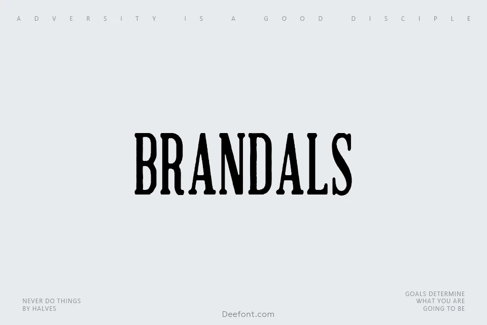 Brandals Font is a bold and vintage-inspired typeface that exudes character and charm. With its strong, decorative serifs and retro aesthetic, this font is perfect for creating designs with a classic yet rugged appeal. Ideal for logos, posters, packaging, and signage, Brandals brings a timeless vibe to any project. Its unique letterforms, combined with ornamental details, make it stand out while maintaining excellent readability. Whether you’re working on branding for a barbershop, a whiskey label, or a retro-themed event, Brandals adds a touch of nostalgia and sophistication. Let this versatile typeface bring your creative ideas to life with style and impact!