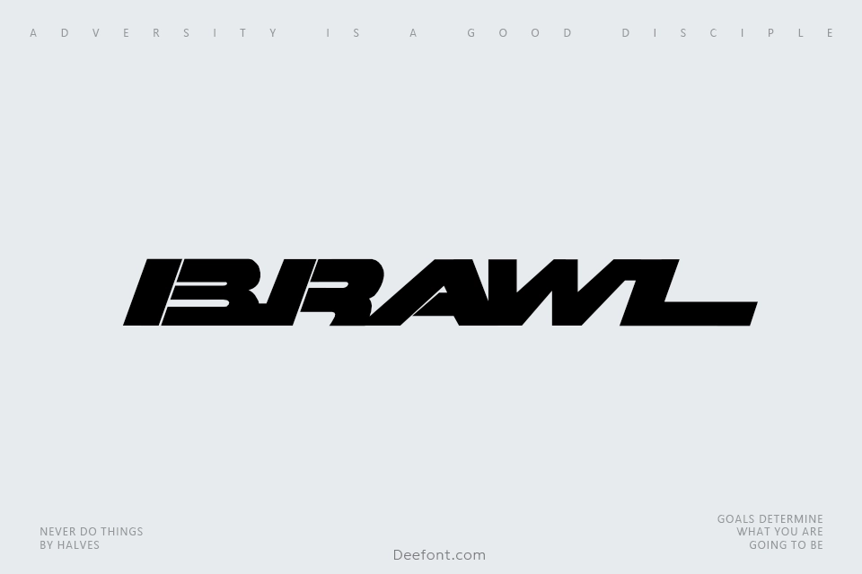 Brawl is a bold, aggressive techno display font characterized by its sharp angles and slanted letterforms that create a sense of motion and intensity. Designed by El Gato en la Luna, this powerful sans-serif typeface delivers strong visual impact with its condensed form and consistent weight. Perfect for headlines, sports projects, signage, and magazine layouts where striking energy and dynamism are essential. The font features all-caps letterforms with a modern geometric aesthetic suitable for games, branding, and contemporary design projects requiring visual dominance and technical edge.
