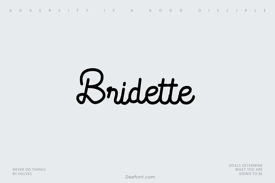 Bridette is an elegant handwritten script font featuring flowing monoline strokes and retro-inspired letterforms. With smooth, natural character designs, this font excels in creative applications including invitations, greeting cards, poster designs, social media graphics, and decorative displays. The delicate handwritten aesthetic brings warmth and personality to design projects, making it ideal for boutique branding, lifestyle content, and artistic compositions that require a personal, human touch.