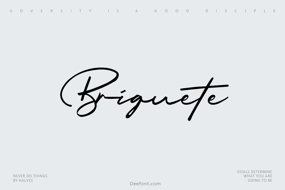 Briquete is a beautiful and refined signature script font designed by Ferry Ardana Putra and Bluetype. This elegant handwritten font features fluid, graceful curves and a natural brush pen aesthetic, making it perfect for branding projects, wedding designs, invitations, stationery, social media posts, advertisements, product packaging, and artistic typography. With its modern flowing style and sophisticated character design, Briquete brings a personal, charming touch to any creative project.