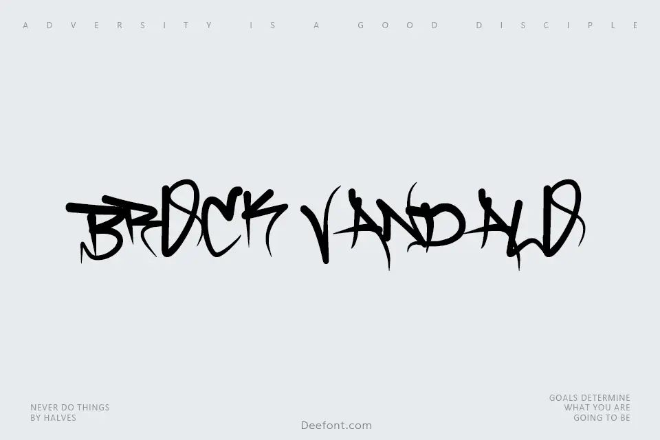Brock Vandalo is a bold and powerful display font that exudes strength and confidence. Designed with sharp angles and strong lines, it features a distinctive graffiti-inspired aesthetic perfect for headlines, posters, logos, and branding materials. This font is inspired by the edginess and rebelliousness of street art, making it ideal for projects demanding a gritty and urban feel. With 236 unique glyphs, Brock Vandalo delivers a striking visual impact suitable for creative and contemporary designs.