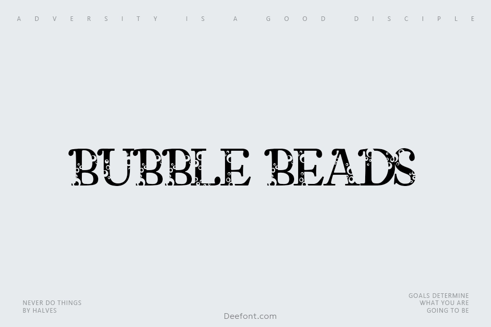 Bubble Beads is a playful and whimsical decorative typeface that perfectly balances formal elegance with quirky charm. Designed as a header font, it features distinctive knocked-out bubble and bead-shaped letterforms with cute rounded serifs on each character. The typeface showcases bold, rounded letterforms adorned with small bubbles, creating a cheerful and bubbly style perfect for branding, advertising, packaging, and creative projects that require a lively and engaging appearance.