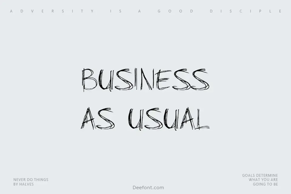 Business As Usual is a bold, hand-drawn script font with a scratchy, doodled aesthetic that captures the essence of notebook sketches and spontaneous creativity. The font features irregular letterforms and textured strokes, making it perfect for posters, websites, casual branding, and display applications. Its artistic, unpolished character brings personality and charm to headlines and creative projects, evoking a sense of playfulness and authenticity ideal for designers seeking unique display typography.