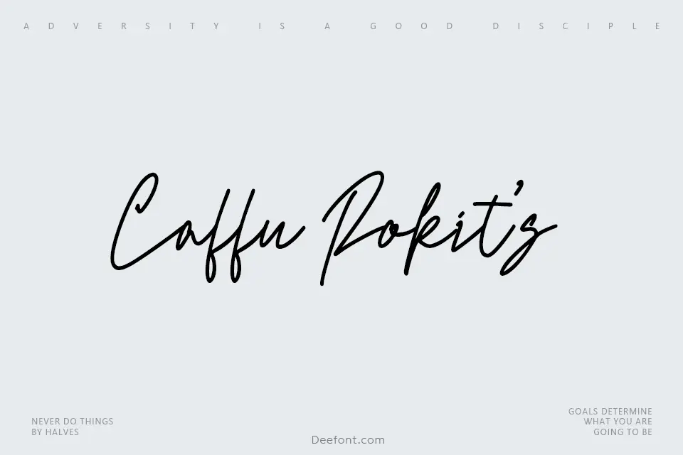 Caffu Rokit’s is a distinctive monoline signature script typeface featuring smooth, flowing letterforms with consistent stroke weight throughout. The font exhibits elegant handwritten characteristics, making it perfect for eye-catching display applications, poster designs, invitation cards, and creative title work. Its modern yet personal aesthetic combines legibility with artistic flair, offering users a versatile solution for projects requiring a casual yet refined typographic voice.