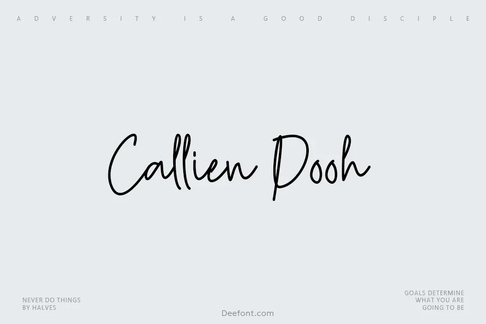 Callien Pooh is a flowing signature script with smooth monoline strokes, delicate curves and natural handwritten rhythm, ideal for high-end logos, fashion branding, product packaging, photography watermarks, wedding invitations, social media quotes and elegant title designs. Perfect for blogs, lookbooks and boutique stationery branding.