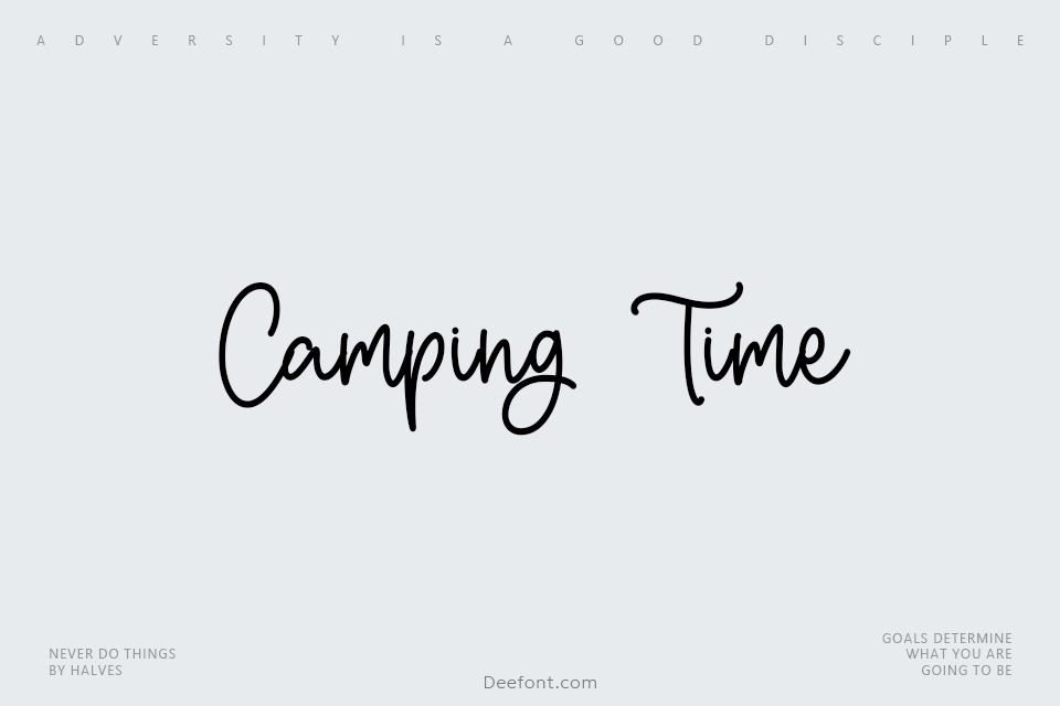 Camping Time is a light, elegant handwritten script font designed by Aldi Raya Pradipta that brings a personal, playful touch to creative projects. Perfect for greeting cards, invitations, stationery, logos, and titles, this typeface combines natural flowing strokes with a semi-light weight that maintains excellent readability. Its charming character makes it ideal for designs requiring a friendly, approachable aesthetic with contemporary appeal.