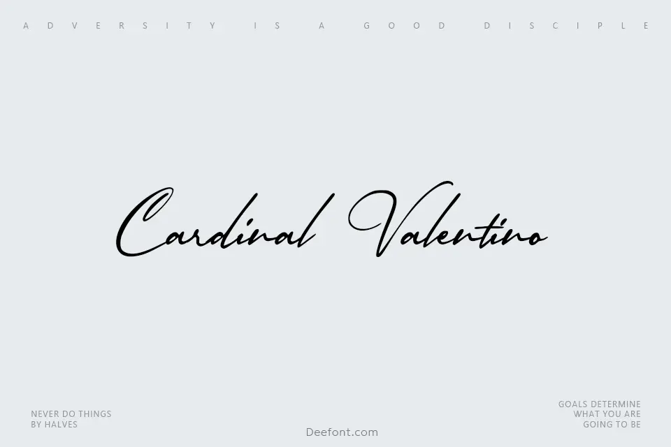 Cardinal Valentino is a refined script typeface characterized by flowing, graceful cursive strokes that evoke sophistication and elegance. The font features smooth, connected letterforms with a fluid calligraphic quality, delivering a luxurious aesthetic ideal for upscale branding, wedding invitations, luxury packaging, and formal display applications. Its handwritten nature combined with refined execution makes it suitable for elegant signage, high-end logos, and sophisticated editorial designs requiring a touch of feminine grace and premium appeal.