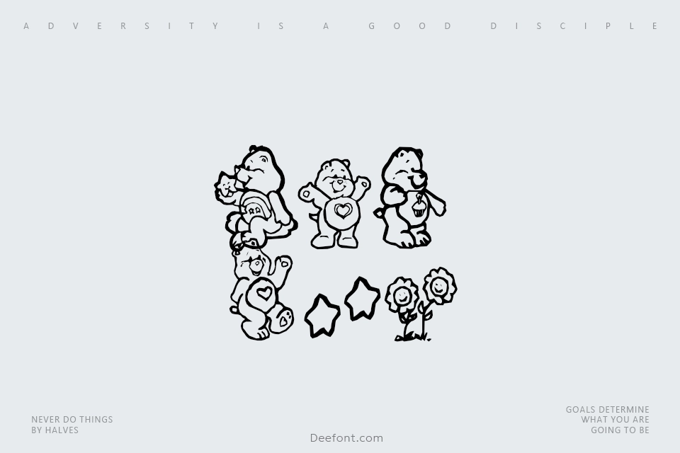Care Bears is a playful and whimsical dingbats font designed with rounded letterforms and creative special characters perfect for children’s projects and fun designs. This decorative typeface features 628 characters including geometric shapes, symbols, and playful glyphs ideal for greeting cards, invitations, and kid-friendly branding. The font’s casual and friendly appearance makes it perfect for projects requiring a fun and approachable aesthetic.