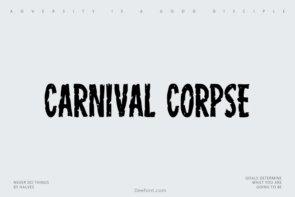 Carnival Corpse is a bold, distressed display font featuring a horror-themed aesthetic with multiple style variations. Originally designed by Iconian Fonts and released in 2016, this decorative typeface offers 19 different font files including shadow, expanded, rotated, and staggered variants. With its rough texture and chipped appearance, Carnival Corpse excels at creating eye-catching, spine-tingling designs perfect for Halloween posters, horror movie titles, themed event invitations, and spooky merchandise. The font’s unique distressed style combines carnival flair with macabre charm, making it ideal for projects requiring a bold, impactful typography with mystery and intrigue.