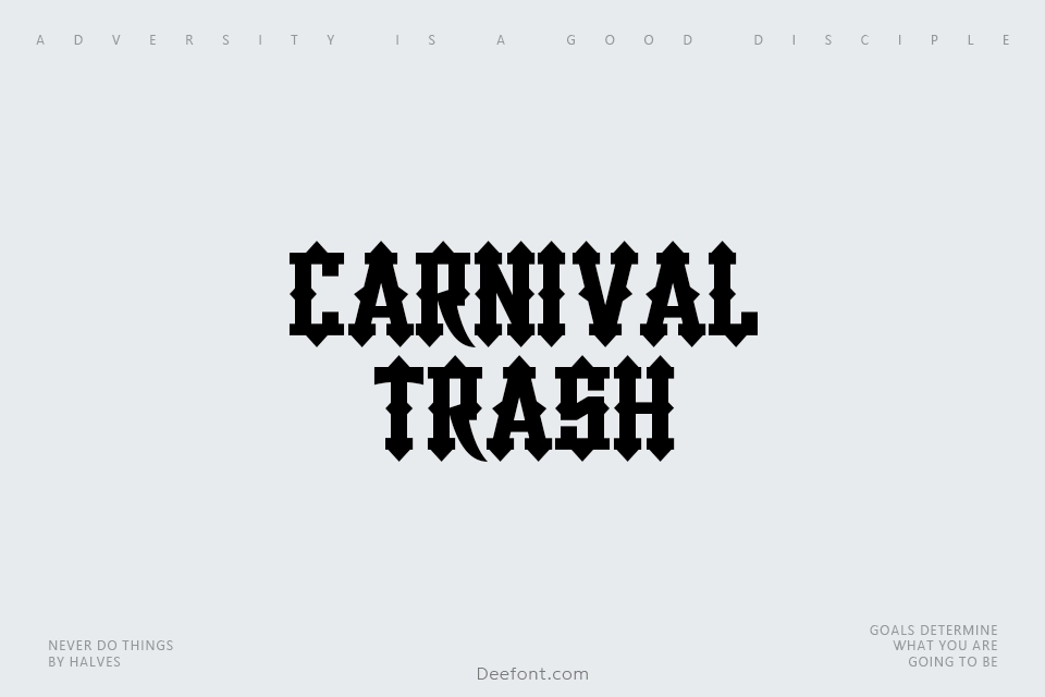 Carnival Trash is a bold, modern display font with jagged and distressed styling, perfect for creating impactful designs. This Gothic-inspired typeface features a tall, striking design with rough edges that makes it ideal for posters, branding, and eye-catching headlines. The font’s unique trash aesthetic adds personality to any creative project while maintaining readability in larger sizes. With its contemporary yet playful character, Carnival Trash brings dramatic flair to entertainment, festival, and promotional materials. The font’s distinctive style delivers maximum visual impact for designers seeking bold typography solutions.