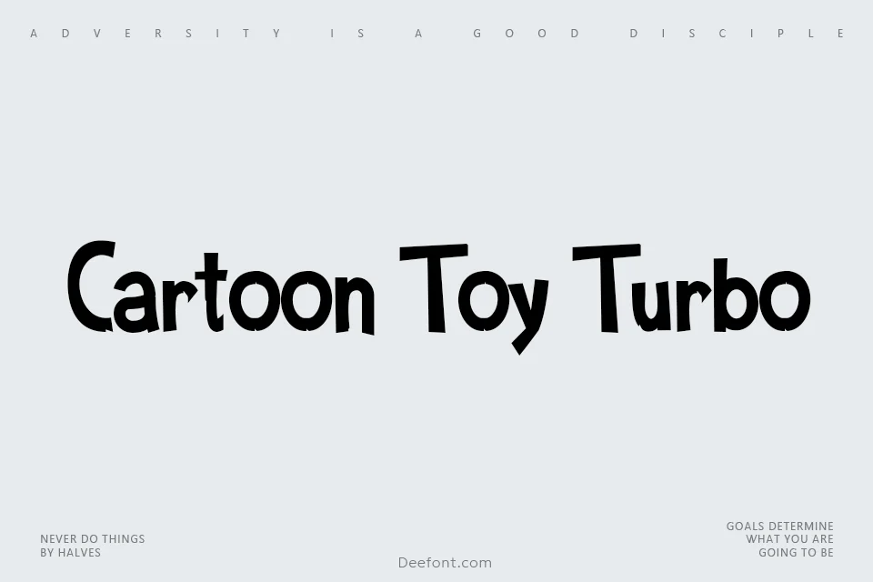 Cartoon Toy Turbo is a playful and cheerful display font perfect for designs targeting children and lighthearted projects. Featuring quirky cartoon visuals with casual serifs and fun irregularities, this typeface brings a joyful, irresistible touch to your work. Ideal for book covers, posters, school designs, store signage, games, greeting cards, and social media content, it adds a child-friendly, whimsical charm to any creative endeavor.