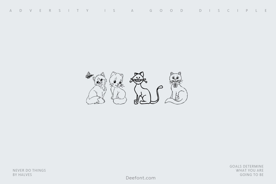 Cats is a whimsical dingbats typeface featuring delightful tender kitten designs perfect for creative typography projects. Designed as a playful animal-themed font, it provides 236 unique glyphs ideal for greeting cards, invitations, children’s books, and decorative applications. The charming cat illustrations make this display font an excellent choice for projects requiring a cute, lighthearted aesthetic appeal.