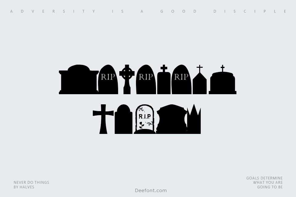 Cemetery Icons is a meticulously crafted symbol and icon font featuring a comprehensive collection of 236 cemetery-themed glyphs. Designed by the acclaimed Spanish typographer Woodcutter, this display typeface excels at bringing themed visual narratives to holiday and Halloween projects. The font’s extensive glyph set makes it an ideal choice for creating distinctive typographic designs that require symbol-based communication. With its versatile icon collection, Cemetery Icons delivers creative possibilities for graphic designers and creative professionals seeking to add atmospheric, thematic depth to their visual compositions.