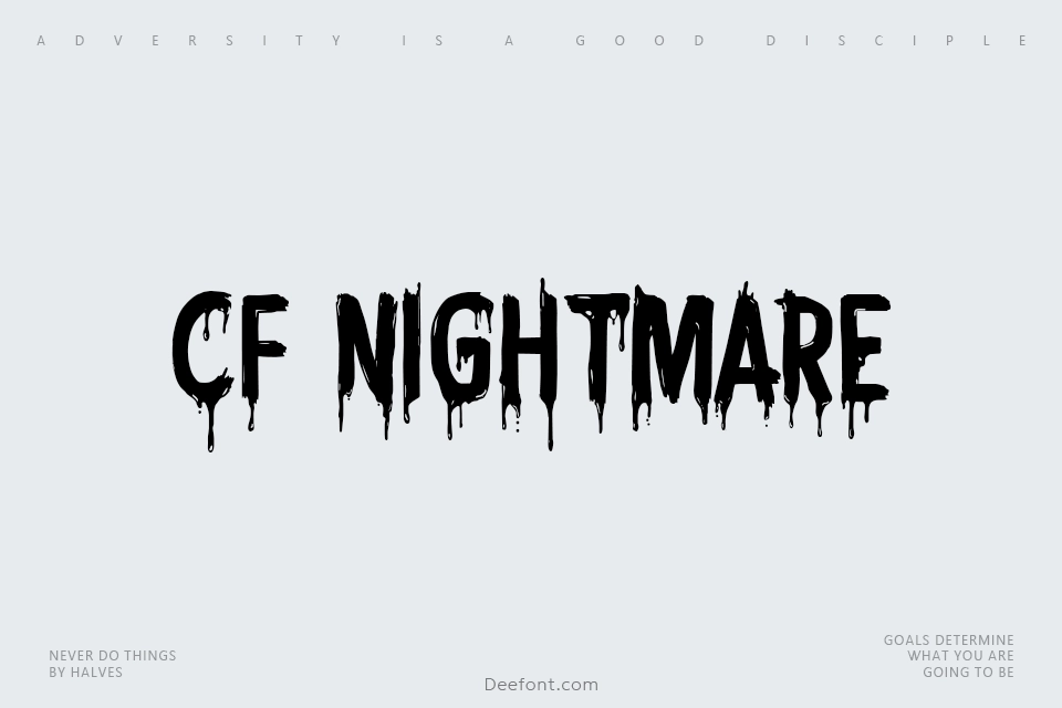 CF Nightmare is an edgy and distinctive display font created by the acclaimed designer Cloutierfontes. Perfect for horror-themed projects, Halloween designs, and gothic aesthetics, this font features sharp edges, jagged lines, and bold letterforms that evoke a dark and mysterious atmosphere. The typeface’s spooky and ominous character makes it ideal for movie posters, book covers, branding materials, and any project requiring a touch of macabre sophistication. With its clean readability despite its unconventional styling, CF Nightmare brings dramatic visual impact to headlines, titles, and creative typography applications.