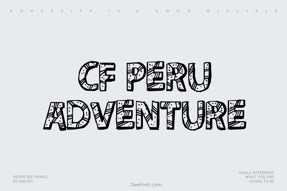 CF Peru Adventure is a bold and decorative display font featuring intricate geometric patterns and playful artistic elements inspired by Aztec and Peruvian design traditions. This adventurous typeface showcases unique decorative details within each letter, characterized by geometric shapes and expressive line work. Perfect for travel brochures, adventure-themed posters, cultural event invitations, and creative branding projects. The uppercase letters exude movement and energy while maintaining an accessible, friendly appearance suitable for headlines and logos.