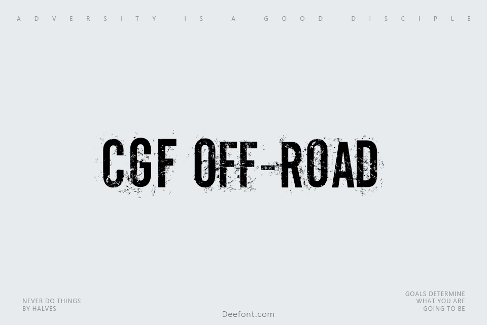CGF Off-Road is a bold, grunge-inspired display typeface featuring a rugged, distressed aesthetic perfect for striking visual compositions. This fancy destroy font combines messy, speckled design elements with angular letterforms to create powerful, eye-catching typography. Ideal for vintage posters, movie titles, album covers, and retro-themed designs, CGF Off-Road delivers strong visual impact through its classic dirty design and weathered character. The font excels in creating attention-grabbing headlines and dramatic display contexts.
