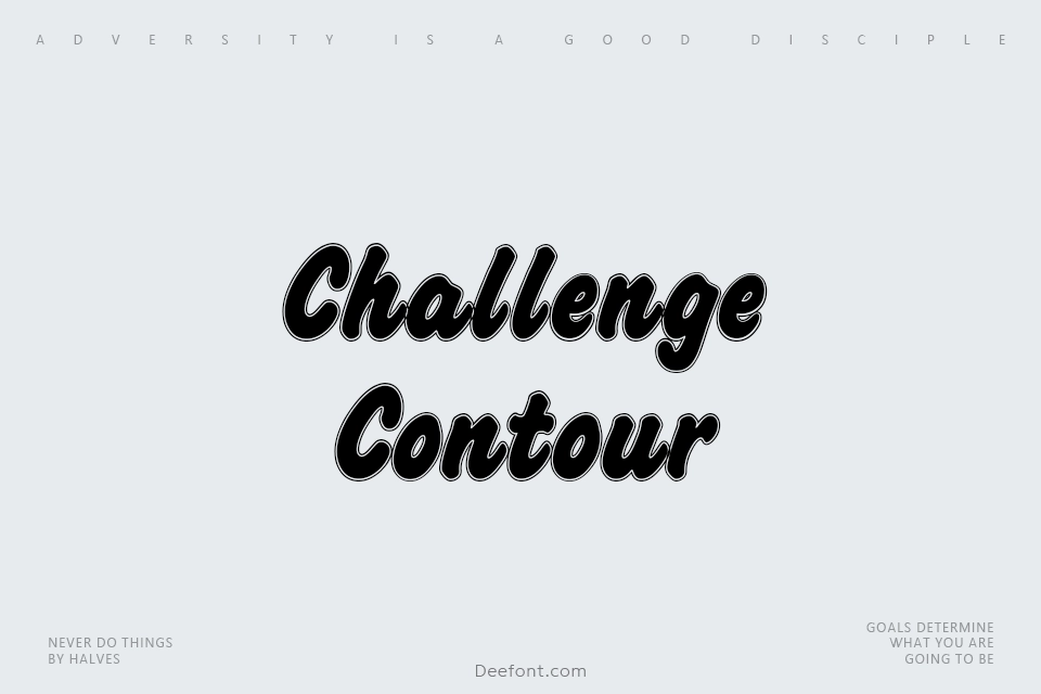 Challenge Contour is a bold, dynamic Display font featuring distinctive outlined characters that create a striking 3D effect. Each letter combines smooth, rounded forms with contoured edges, delivering strong visual impact perfect for headlines, posters, logos, and eye-catching designs. The font maintains consistent proportions across uppercase and lowercase letters while adding playful energy to creative projects. With its geometric boldness and modern aesthetic, it stands out as an ideal choice for designs demanding attention and contemporary flair.