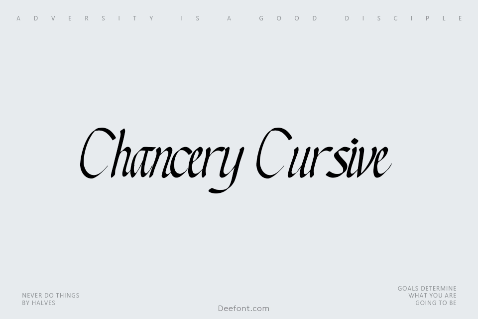 Chancery Cursive is an elegant and flowing cursive font with beautiful calligraphic strokes, featuring ornate uppercase letters and connected lowercase characters. Ideal for formal applications including wedding invitations, certificates, elegant branding projects, and decorative typography. The font maintains smooth sweeping strokes throughout its characters, delivering a sophisticated aesthetic that enhances formal and elegant designs. With 81 glyphs and consistent italicized styling, it provides a cohesive look suitable for headlines, invitations, and decorative text applications.