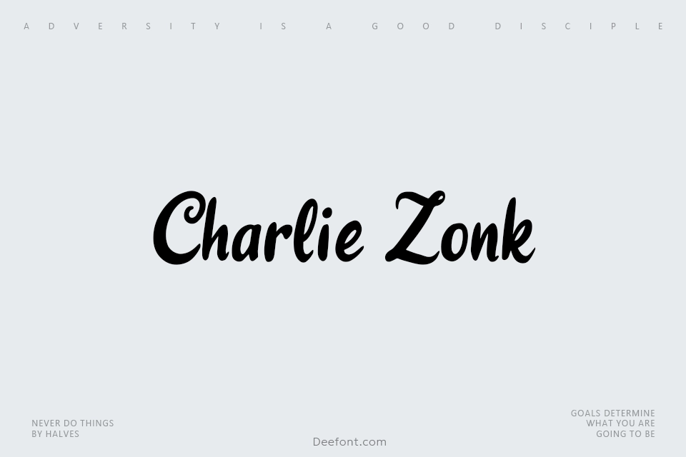 Charlie Zonk is a bold and playful script font featuring flowing, interconnected strokes with distinctive personality. The design showcases exaggerated curves in uppercase letters while maintaining consistent rhythm in lowercase, creating a lively and energetic aesthetic. With moderate stroke contrast and dynamic letterforms, this typeface excels at capturing attention for creative projects requiring personality and charm. Perfect for greeting cards, invitations, branding initiatives, and informal advertising campaigns where expressive typography can elevate visual impact and engagement.