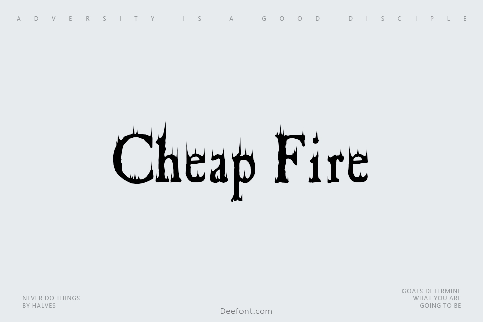 Cheap Fire is a dynamic and fiery display font featuring jagged, flame-like edges that create an intense and energetic aesthetic. Perfect for bold designs, headlines, and creative projects, this decorative typeface brings movement and impact to any typography with its sharp, pointed elements that mimic flickering flames.