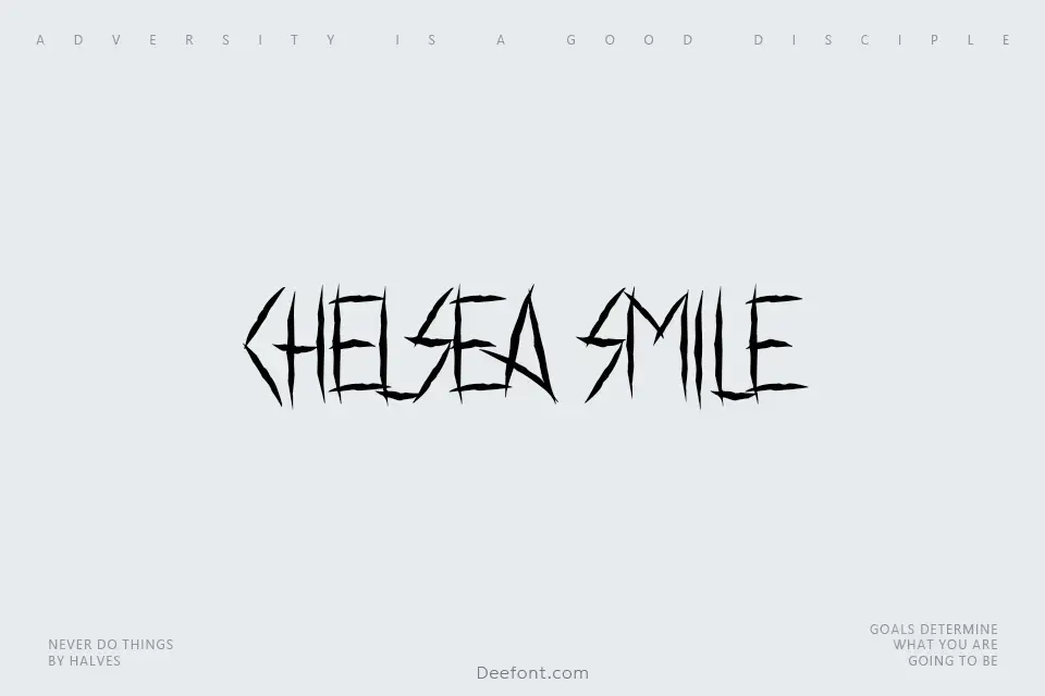 Chelsea Smile is an avant-garde script typeface featuring jagged, angular letterforms with visceral character. Designed by Chequered Ink, this condensed display font exudes raw urban energy through its gritty strokes and pronounced negative space. Ideal for creating impactful headlines, punk rock album artwork, streetwear graphics, Halloween designs, and eye-catching posters that demand immediate visual attention.